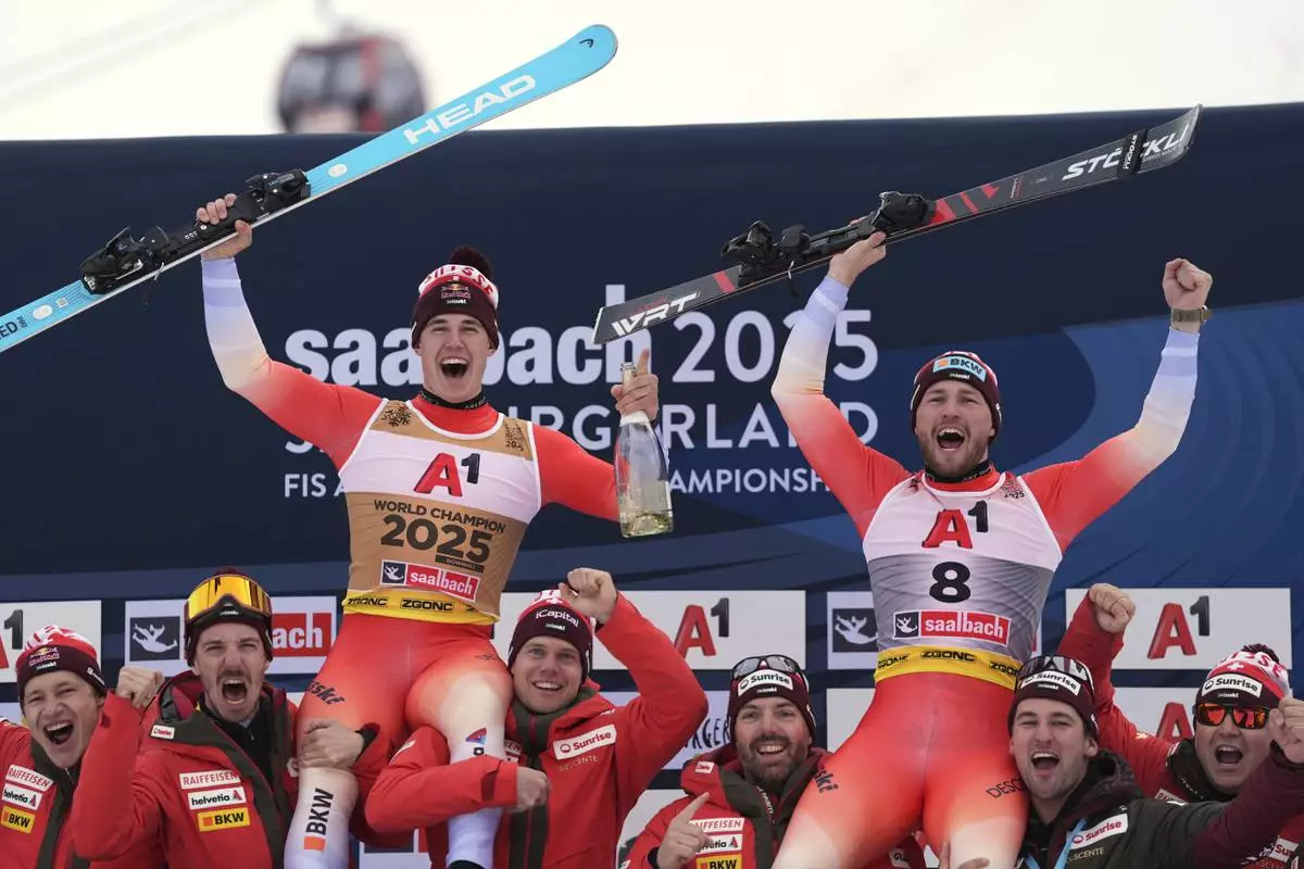 Gold medalist in a men's downhill race Switzerland's Franjo von Allmen, left, and bronze medalist Switzerland's Alexis Monney, celebrate with the team, at the Alpine Ski World Championships, in Saalbach-Hinterglemm, Austria, Sunday, Feb. 9, 2025. (AP Photo/Giovanni Auletta)