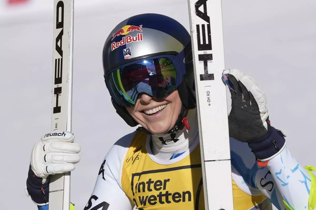United States' Lindsey Vonn smiles at the finish area of a women's downhill race, at the Alpine Ski World Championships, in Saalbach-Hinterglemm, Austria, Saturday, Feb. 8, 2025. (AP Photo/Giovanni Auletta)
