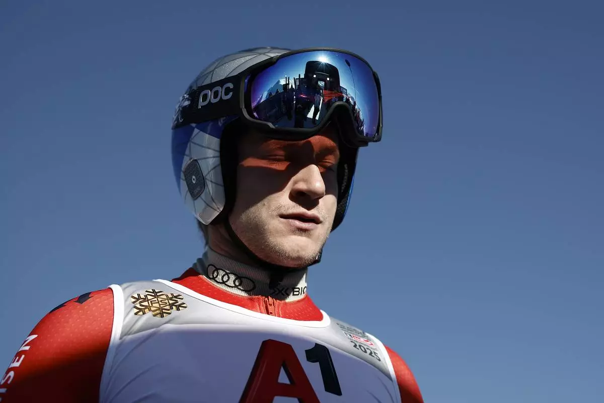 Switzerland's Marco Odermatt is seen ahead of an alpine ski, men's World Cup downhill training, in Garmisch-Partenkirchen, Germany, Saturday, Feb. 1, 2025. (AP Photo/Gabriele Facciotti)