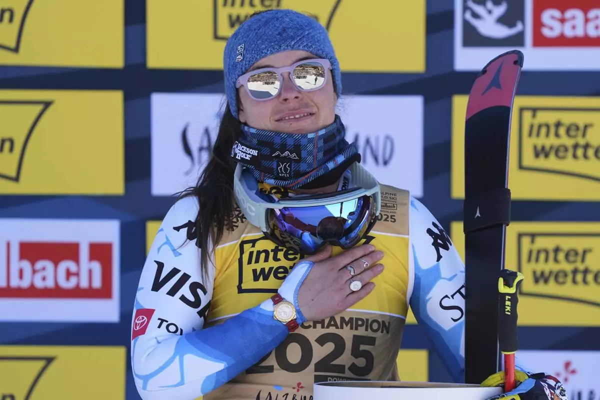United States' Breezy Johnson listens to the national anthem after winning the gold medal in a women's downhill race, at the Alpine Ski World Championships, in Saalbach-Hinterglemm, Austria, Saturday, Feb. 8, 2025. (AP Photo/Giovanni Auletta)