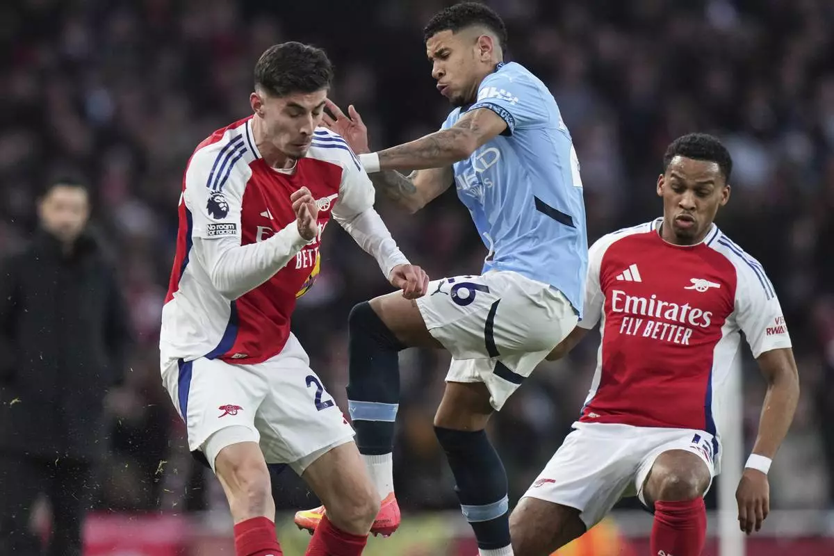 Manchester City's Savinho, center, and Arsenal's Kai Havertz, left, fight for the ball during the English Premier League soccer match between Arsenal and Manchester City at the Emirates stadium in London, Sunday, Feb. 2, 2025. (AP Photo/Alastair Grant)