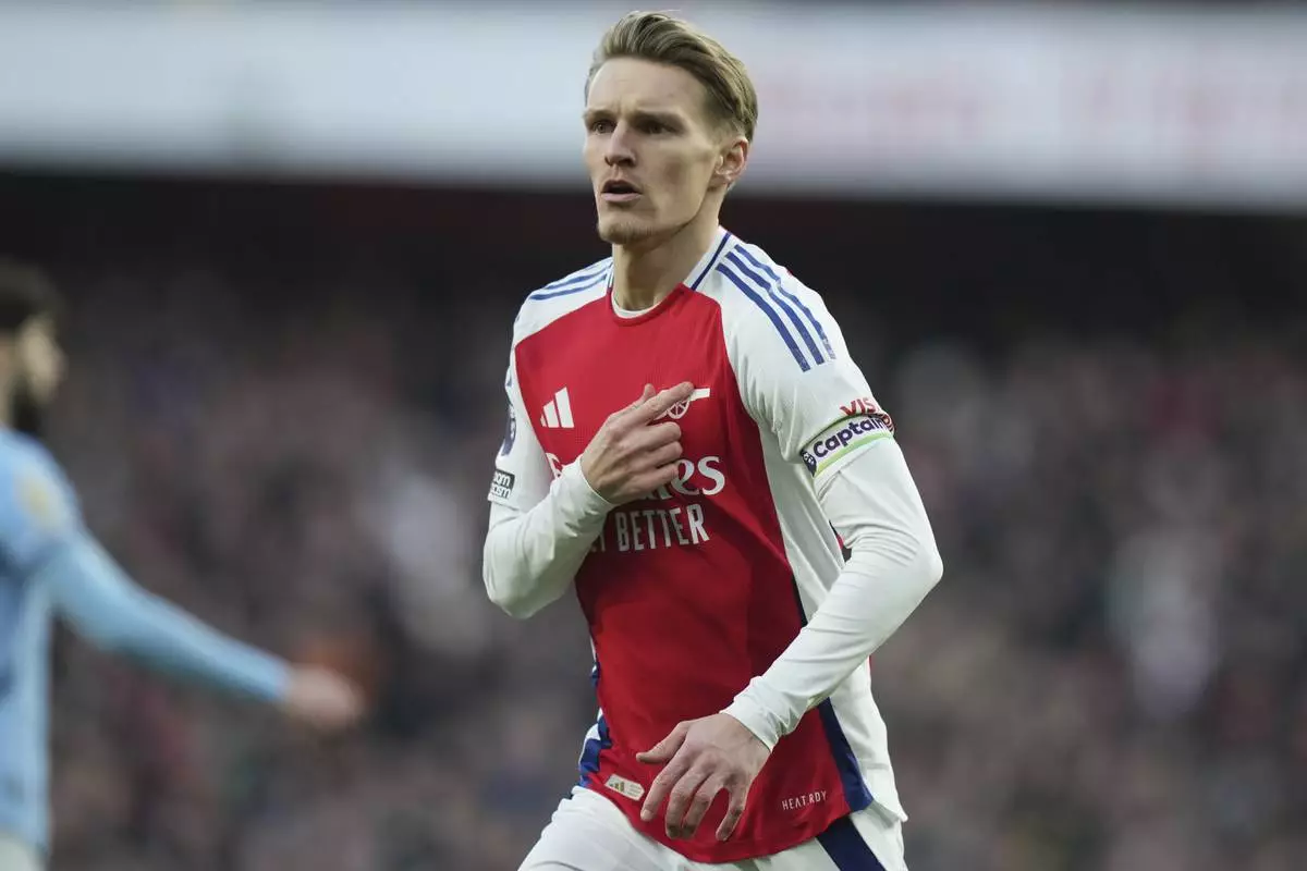 Arsenal's Martin Odegaard celebrates scoring his side's opening goal during the English Premier League soccer match between Arsenal and Manchester City at the Emirates stadium in London, Sunday, Feb. 2, 2025. (AP Photo/Alastair Grant)