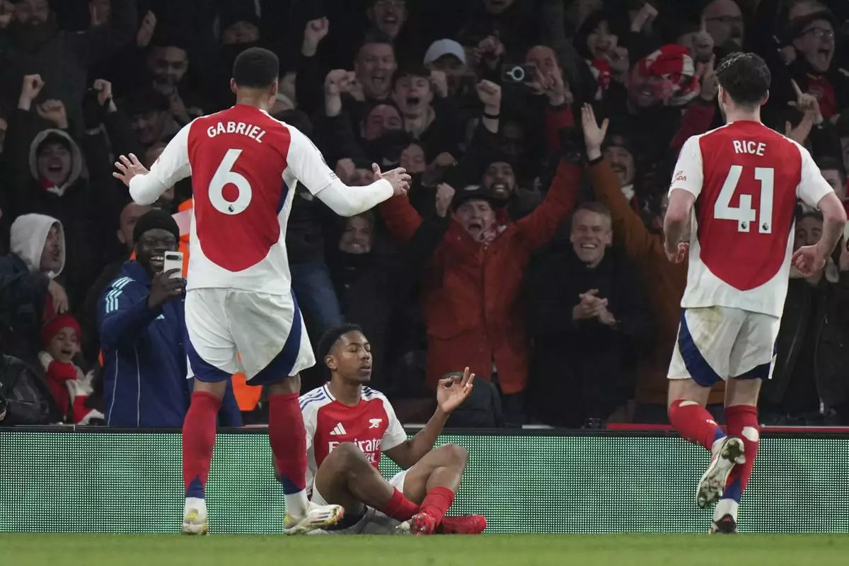 Arsenal's Myles Lewis-Skelly, bottom, celebrates scoring his side's 3rd goal during the English Premier League soccer match between Arsenal and Manchester City at the Emirates stadium in London, Sunday, Feb. 2, 2025. (AP Photo/Alastair Grant)