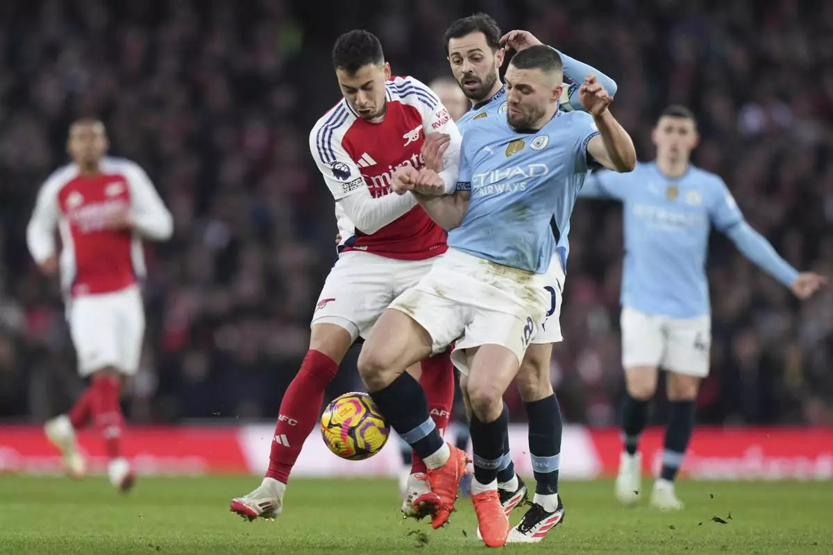 Manchester City's Mateo Kovacic, right, and Arsenal's Gabriel Martinelli fight for the ball during the English Premier League soccer match between Arsenal and Manchester City at the Emirates stadium in London, Sunday, Feb. 2, 2025. (AP Photo/Alastair Grant)