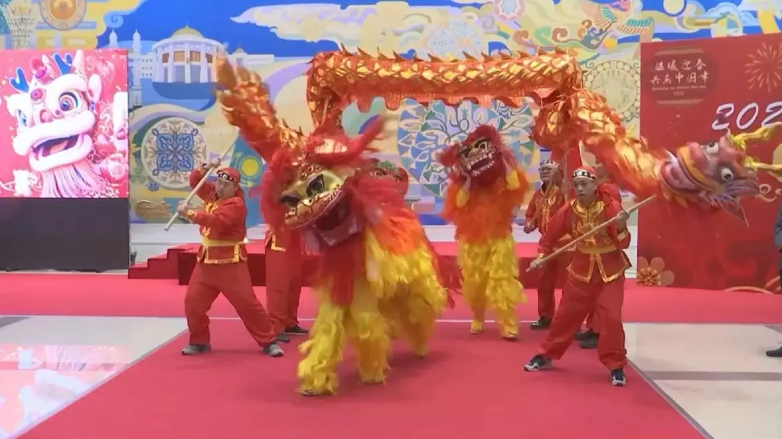 At the Spring Festival reception hosted by the Chinese Embassy in Kazakhstan, guests experienced the festive spirit through vibrant dragon and lion dances, accompanied by lively folk music performances.