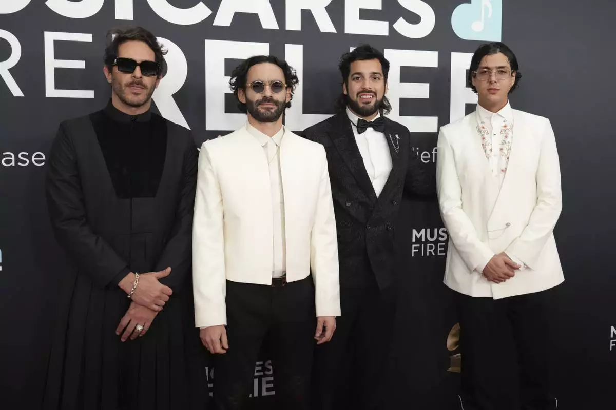 Alejandro Abeijon, from left, Andres Story, Antonio Casas and Alberto Montenegro of Rawayana arrive at the 67th annual Grammy Awards on Sunday, Feb. 2, 2025, in Los Angeles. (Photo by Jordan Strauss/Invision/AP)
