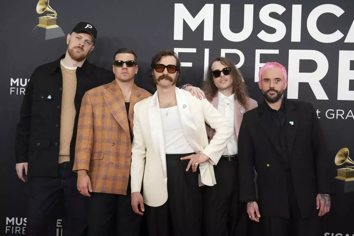 Kenny Beats, from left, Jon Beavis, Lee Kiernan, Mark Bowen, and Joe Talbot arrive at the 67th annual Grammy Awards on Sunday, Feb. 2, 2025, in Los Angeles. (Photo by Jordan Strauss/Invision/AP)