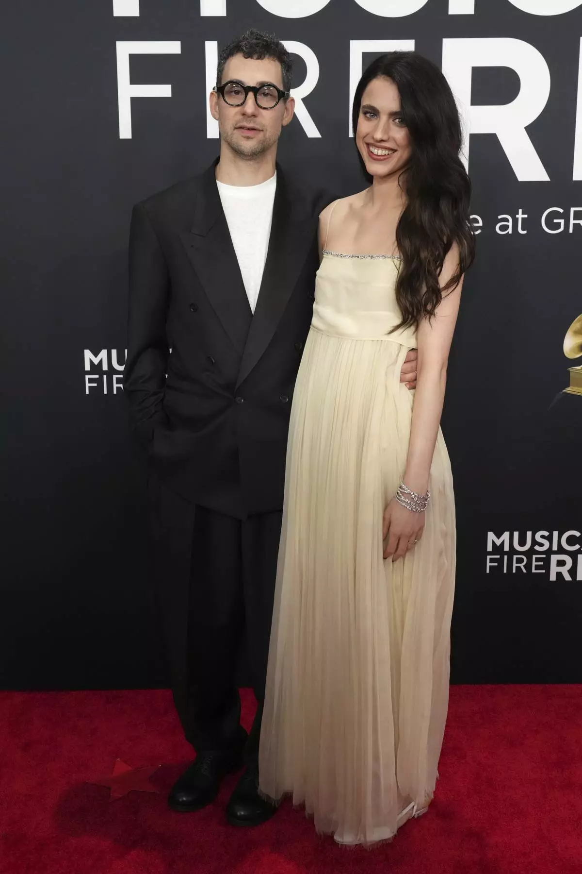 Jack Antonoff, left, and Margaret Qualley arrive at the 67th annual Grammy Awards on Sunday, Feb. 2, 2025, in Los Angeles. (Photo by Jordan Strauss/Invision/AP)