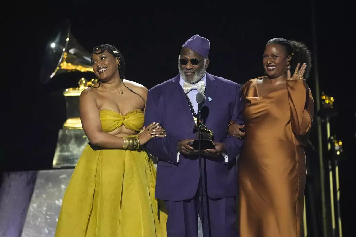 Taj Mahal of The Taj Mahal Sextet accepts the award for best traditional blues album for "Swingin' Live at The Church in Tulsa" during the 67th annual Grammy Awards on Sunday, Feb. 2, 2025, in Los Angeles. (AP Photo/Chris Pizzello)
