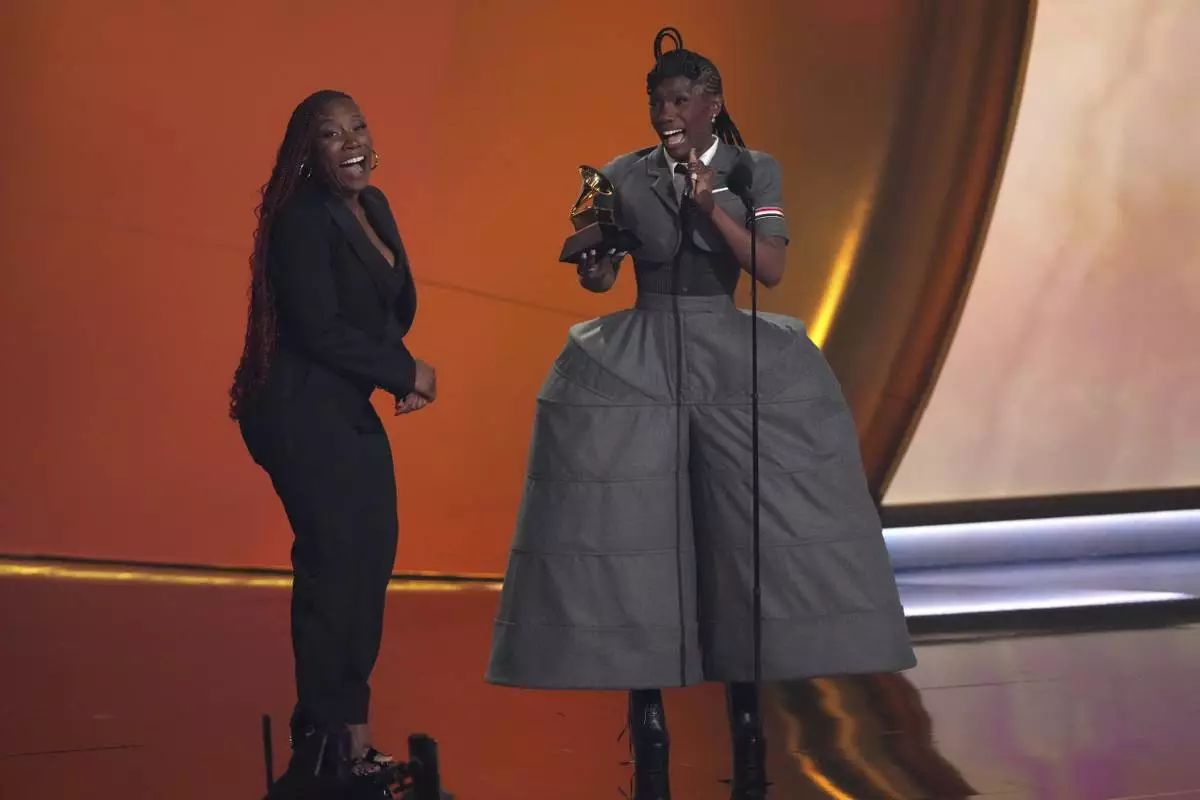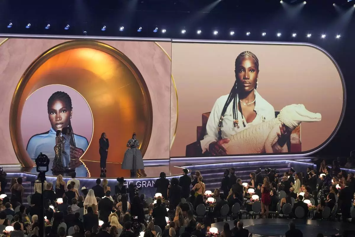 Doechii, center, accepts the award for best rap album for "Alligator Bites Never Heal" during the 67th annual Grammy Awards on Sunday, Feb. 2, 2025, in Los Angeles. Celesia Moore looks on from left(AP Photo/Chris Pizzello)