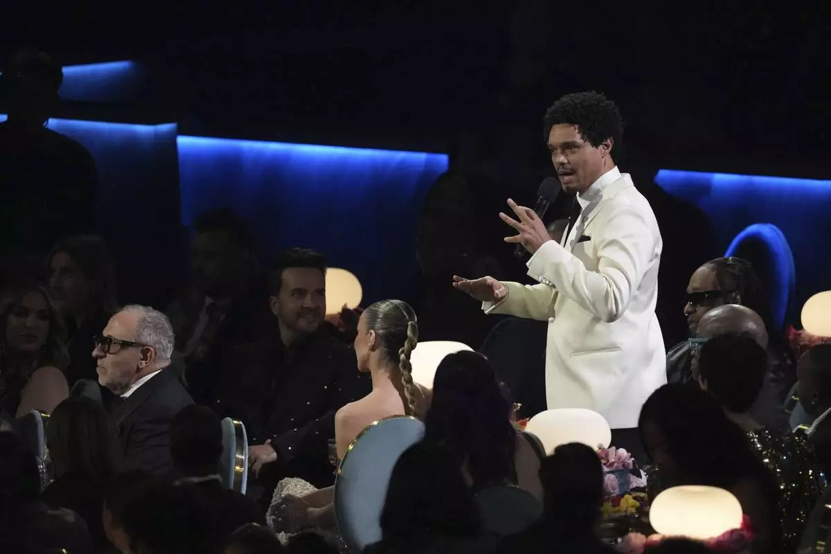 Host Trevor Noah speaks during the 67th annual Grammy Awards on Sunday, Feb. 2, 2025, in Los Angeles. (AP Photo/Chris Pizzello)
