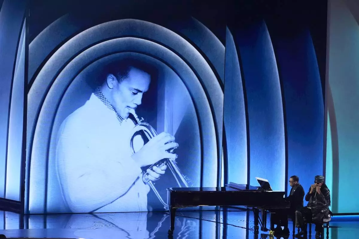 Will Smith, left, speaks while Herbie Hancock plays the piano during the 67th annual Grammy Awards on Sunday, Feb. 2, 2025, in Los Angeles. (AP Photo/Chris Pizzello)