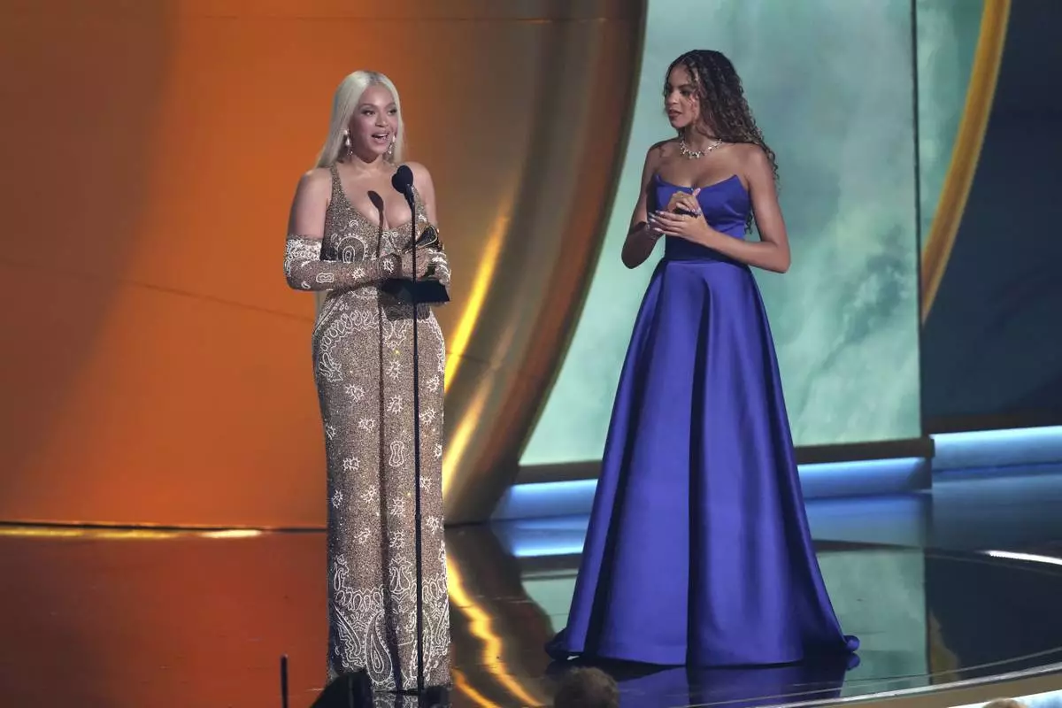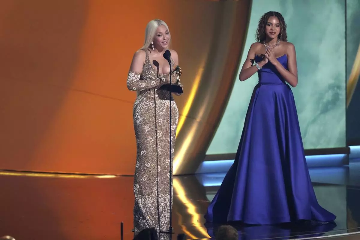 Beyonce accepts the award for album of the year for "COWBOY CARTER during the 67th annual Grammy Awards on Sunday, Feb. 2, 2025, in Los Angeles. Blue Ivy Carter looks on from right.(AP Photo/Chris Pizzello)