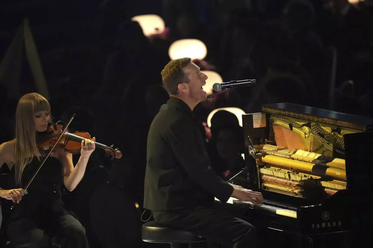 Chris Martin performs "All My Love" for the In Memoriam segment during the 67th annual Grammy Awards on Sunday, Feb. 2, 2025, in Los Angeles. (AP Photo/Chris Pizzello)