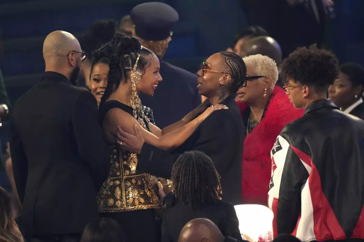 Billie Eilish, left, and Cynthia Erivo embrace in the audience during the 67th annual Grammy Awards on Sunday, Feb. 2, 2025, in Los Angeles. (AP Photo/Chris Pizzello)