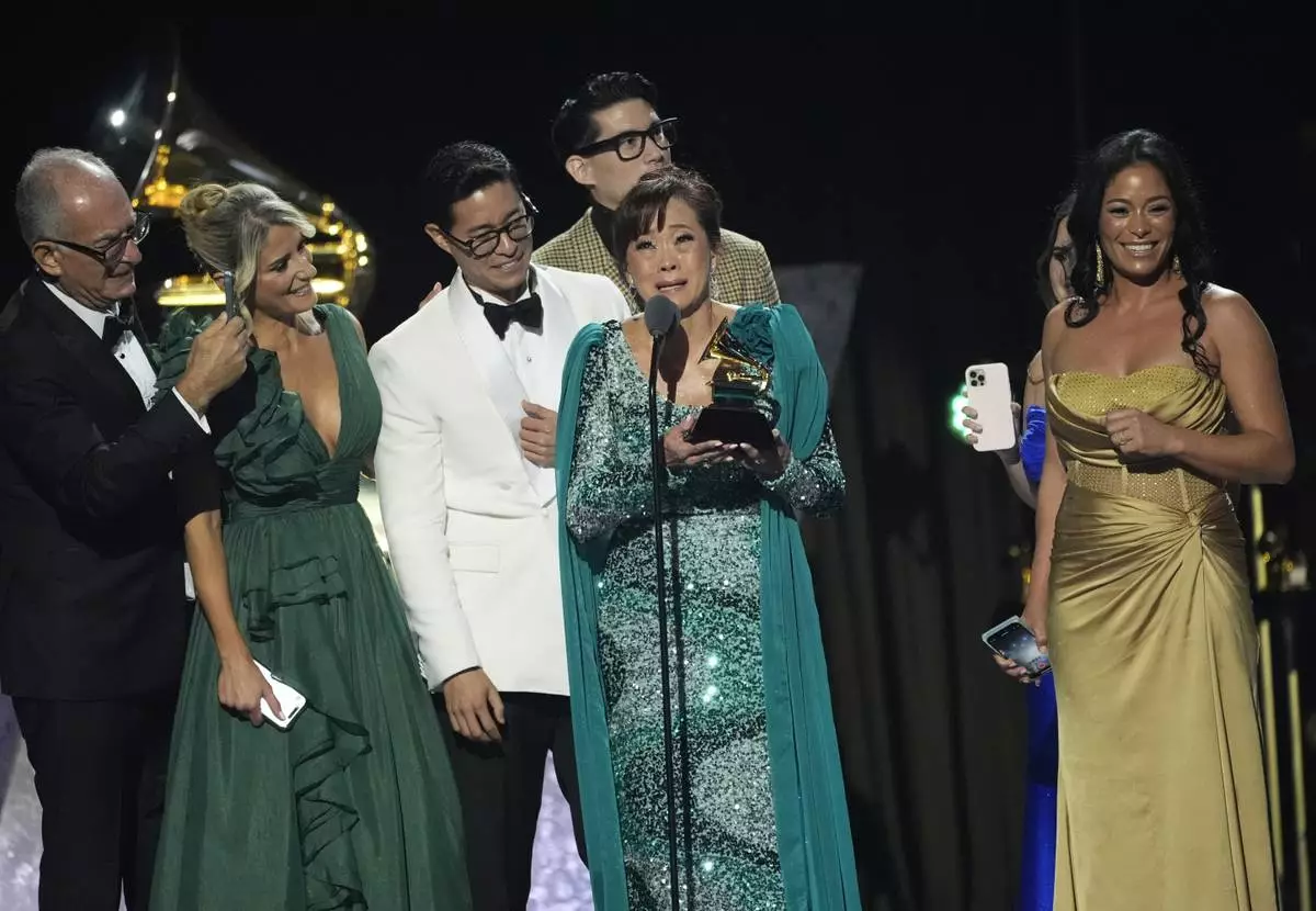 Tony Succar, left, and Mimy Succar accept the award for best tropical latin album for "Alma, Corazon y Salsa (Live at Gran Teatro Nacional)" during the 67th annual Grammy Awards on Sunday, Feb. 2, 2025, in Los Angeles. (AP Photo/Chris Pizzello)