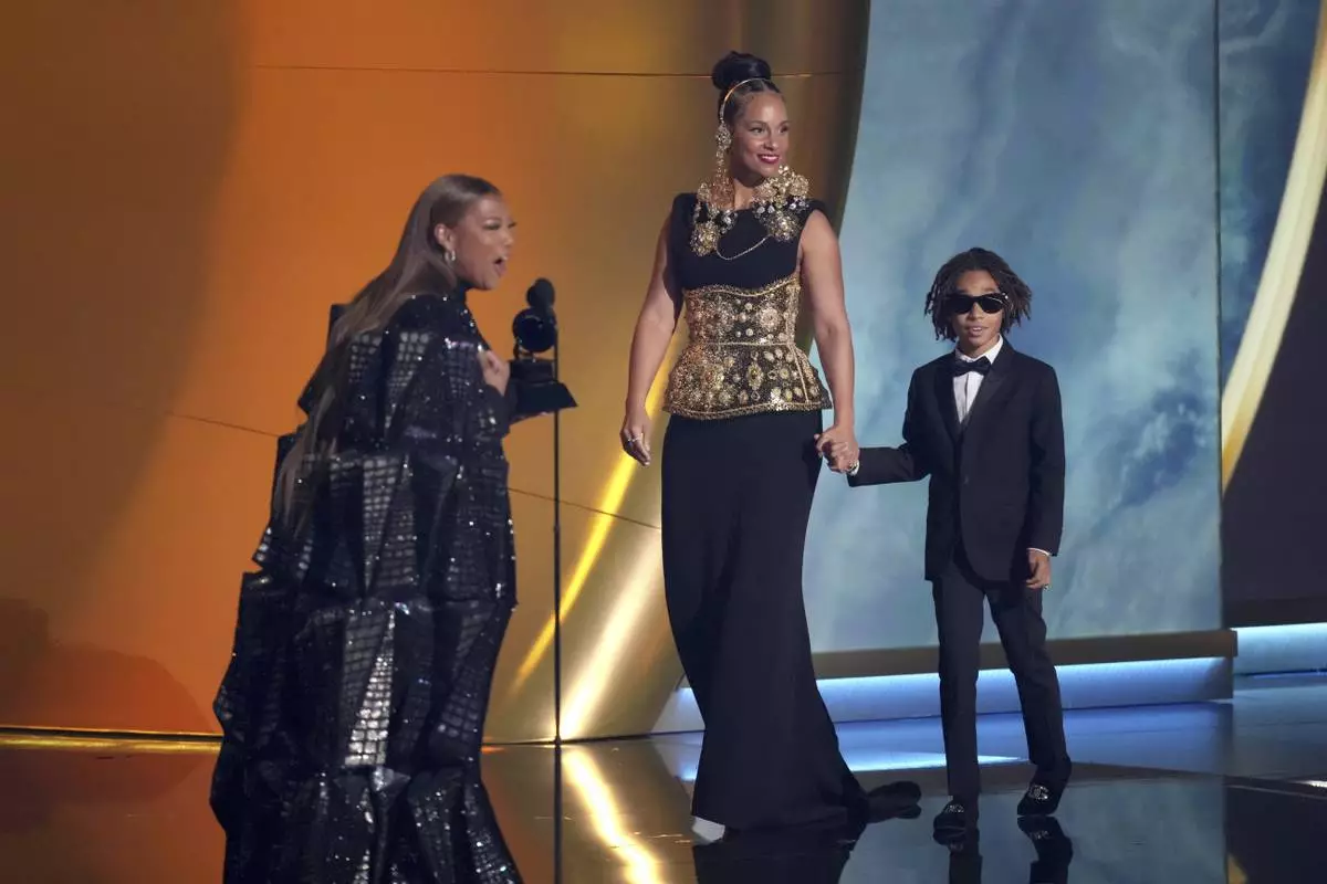 Queen Latifah, left, presents the Dr. Dre Global Impact Award to Alicia Keys during the 67th annual Grammy Awards on Sunday, Feb. 2, 2025, in Los Angeles. Genesis Ali Dean looks on from right.(AP Photo/Chris Pizzello)