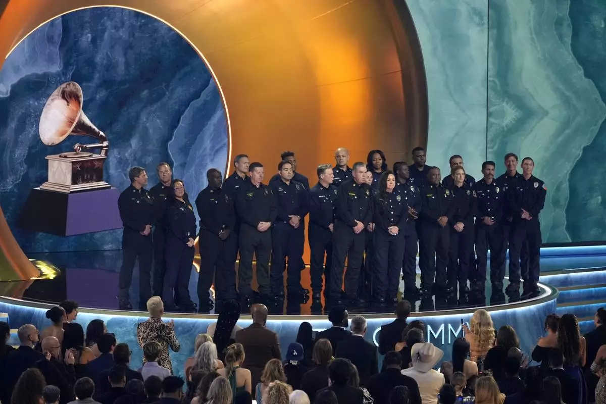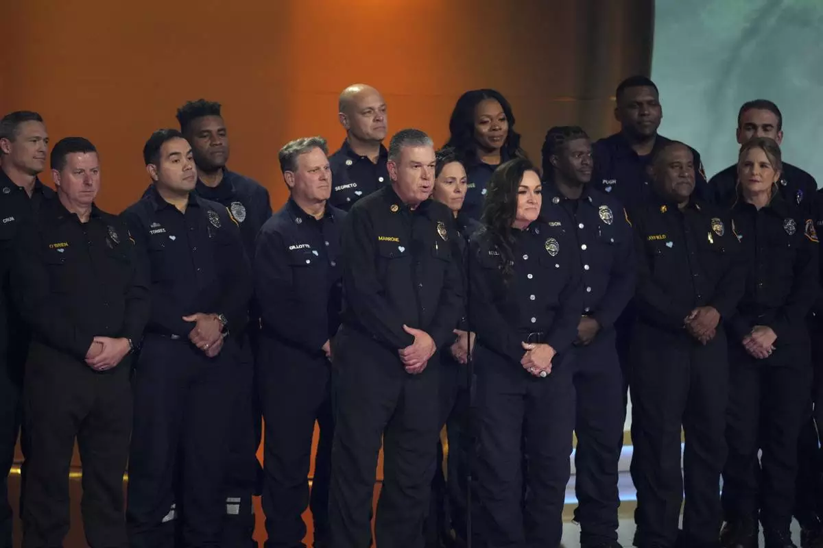Members of the County of Los Angeles Fire Department present the award for album of the year during the 67th annual Grammy Awards on Sunday, Feb. 2, 2025, in Los Angeles. (AP Photo/Chris Pizzello)