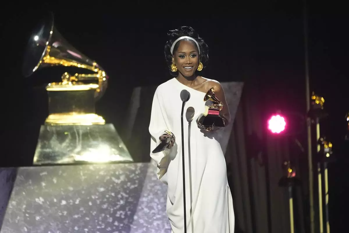 Muni Long accepts the award for best r&b performance for "Made For Me (Live On BET)" during the 67th annual Grammy Awards on Sunday, Feb. 2, 2025, in Los Angeles. (AP Photo/Chris Pizzello)