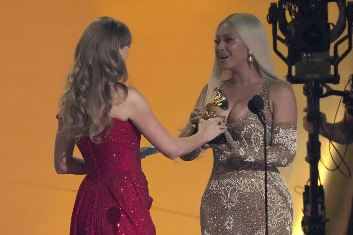 Taylor Swift, left, presents the award for best country album to Beyonce for "COWBOY CARTER" during the 67th annual Grammy Awards on Sunday, Feb. 2, 2025, in Los Angeles. (AP Photo/Chris Pizzello)