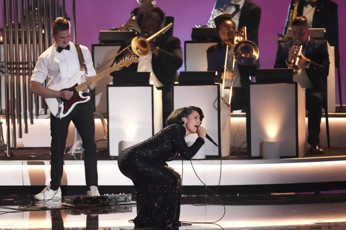 Raye performs "Oscar Winning Tears" during the 67th annual Grammy Awards on Sunday, Feb. 2, 2025, in Los Angeles. (AP Photo/Chris Pizzello)