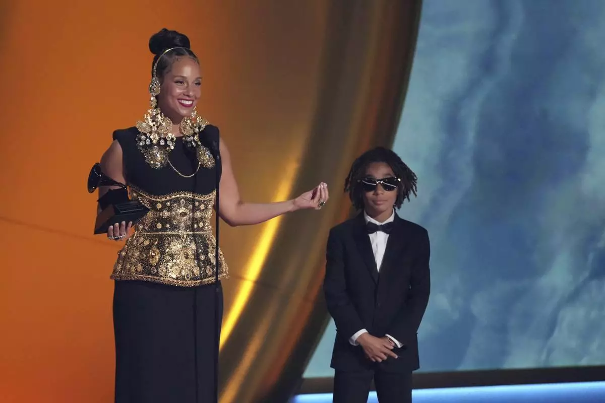 Alicia Keys accepts the Dr. Dre Global Impact Award during the 67th annual Grammy Awards on Sunday, Feb. 2, 2025, in Los Angeles. Genesis Ali Dean looks on from right.(AP Photo/Chris Pizzello)