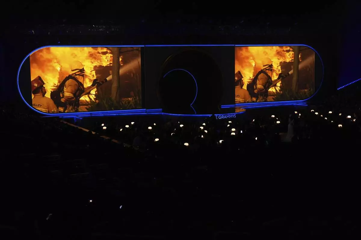 Scenes from the fires in L.A. shown during the 67th annual Grammy Awards on Sunday, Feb. 2, 2025, in Los Angeles. (AP Photo/Chris Pizzello)