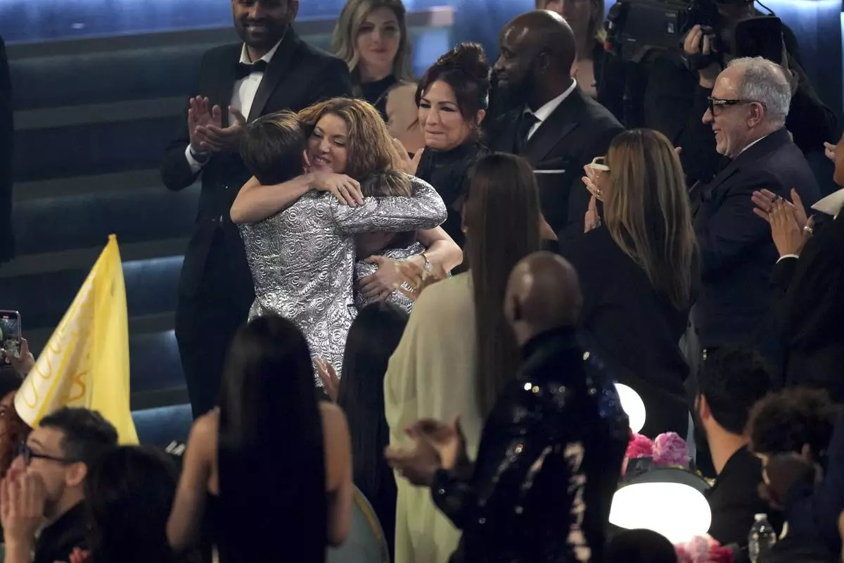Milan Pique Mebarak, left, Shakira, center, and Sasha Pique Mebarak embrace after she wins the best latin pop album during the 67th annual Grammy Awards on Sunday, Feb. 2, 2025, in Los Angeles. (AP Photo/Chris Pizzello)