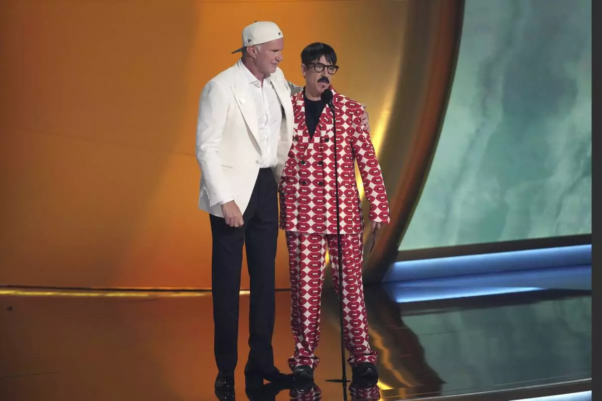 Chad Smith, left, and Anthony Kiedis of Red Hot Chili Peppers presents the award for best pop vocal album during the 67th annual Grammy Awards on Sunday, Feb. 2, 2025, in Los Angeles. (AP Photo/Chris Pizzello)