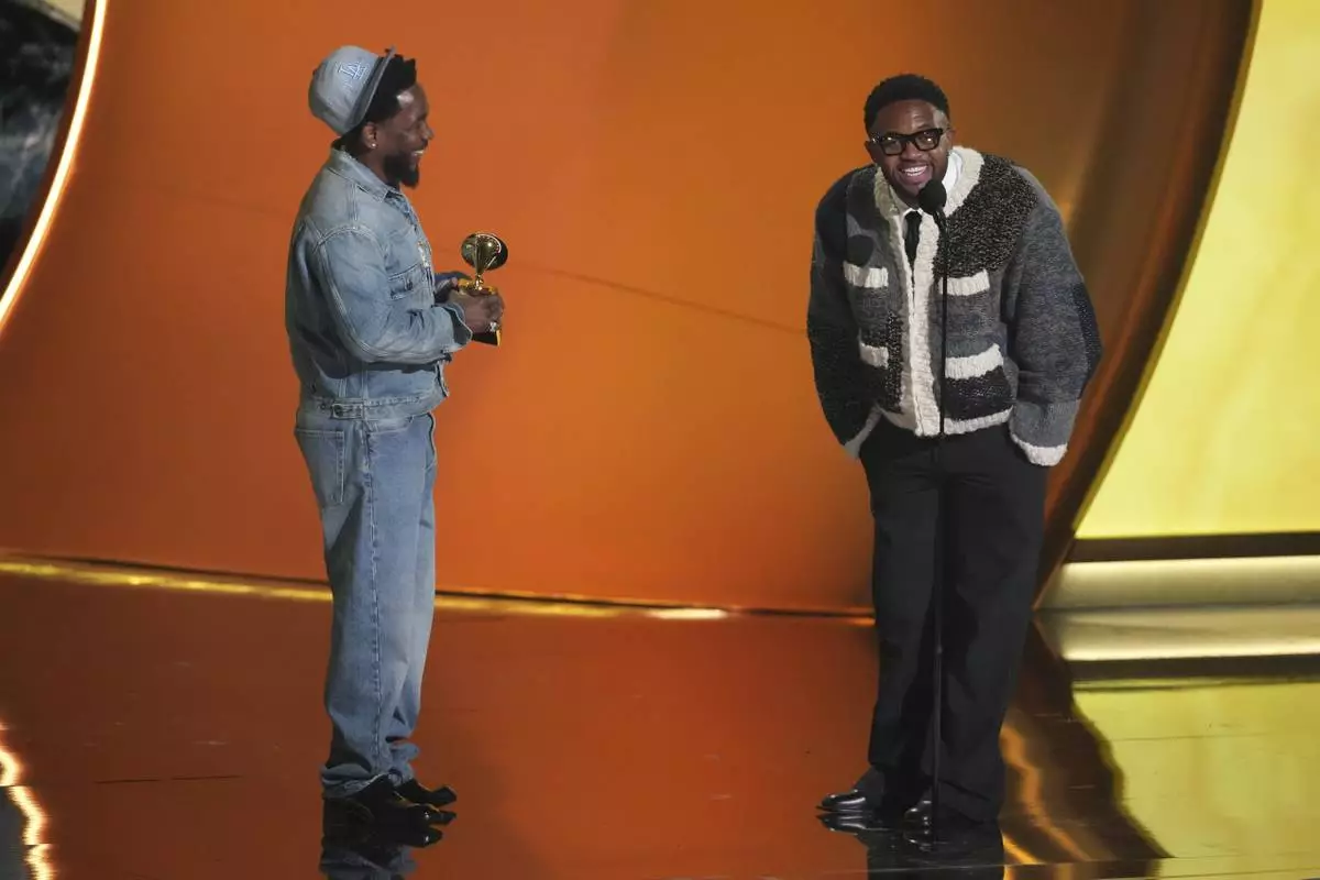 Kendrick Lamar, left, accepts the record of the year award for "Not Like Us during the 67th annual Grammy Awards on Sunday, Feb. 2, 2025, in Los Angeles. Mustard looks on from right. (AP Photo/Chris Pizzello)