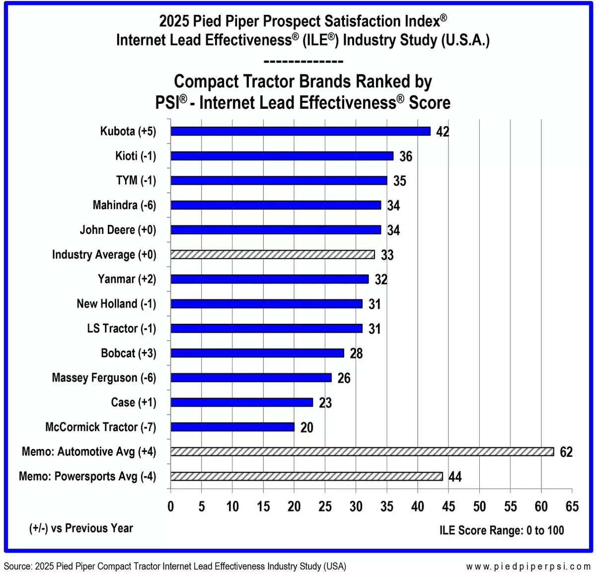 Kubota dealerships ranked highest in the 2025 Pied Piper PSI ® Internet Lead Effectiveness ® (ILE ® ) Compact Tractor Industry Study, which measured responsiveness to internet sales leads coming through dealership websites. Following Kubota were Kioti, TYM, Mahindra and John Deere.