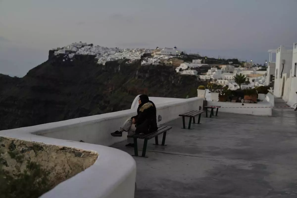 A tourist sits at Firostefani as Greek authorities are taking emergency measures in response to intense seismic activity on the popular Aegean Sea holiday island of Santorini, southern Greece, Monday, Feb. 3, 2025. (AP Photo/Petros Giannakouris)