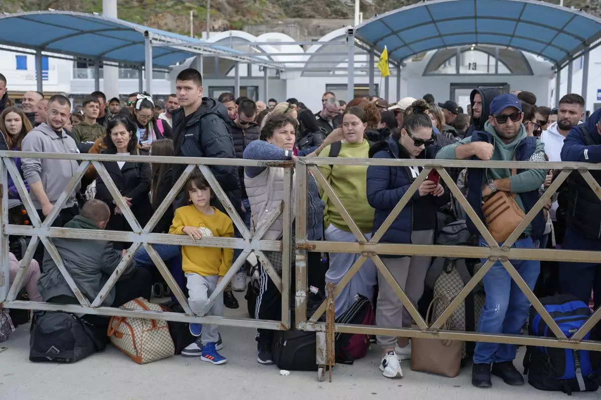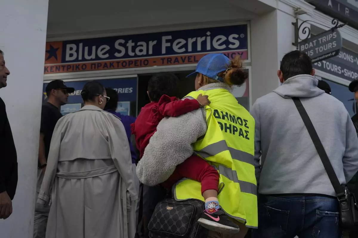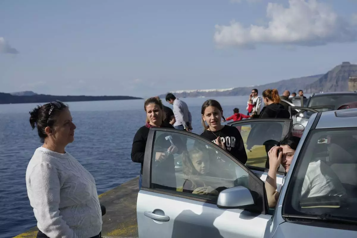 A queue of cars and hundreds of people formed at the island's main port Monday afternoon to catch a ferry leaving Santorini.