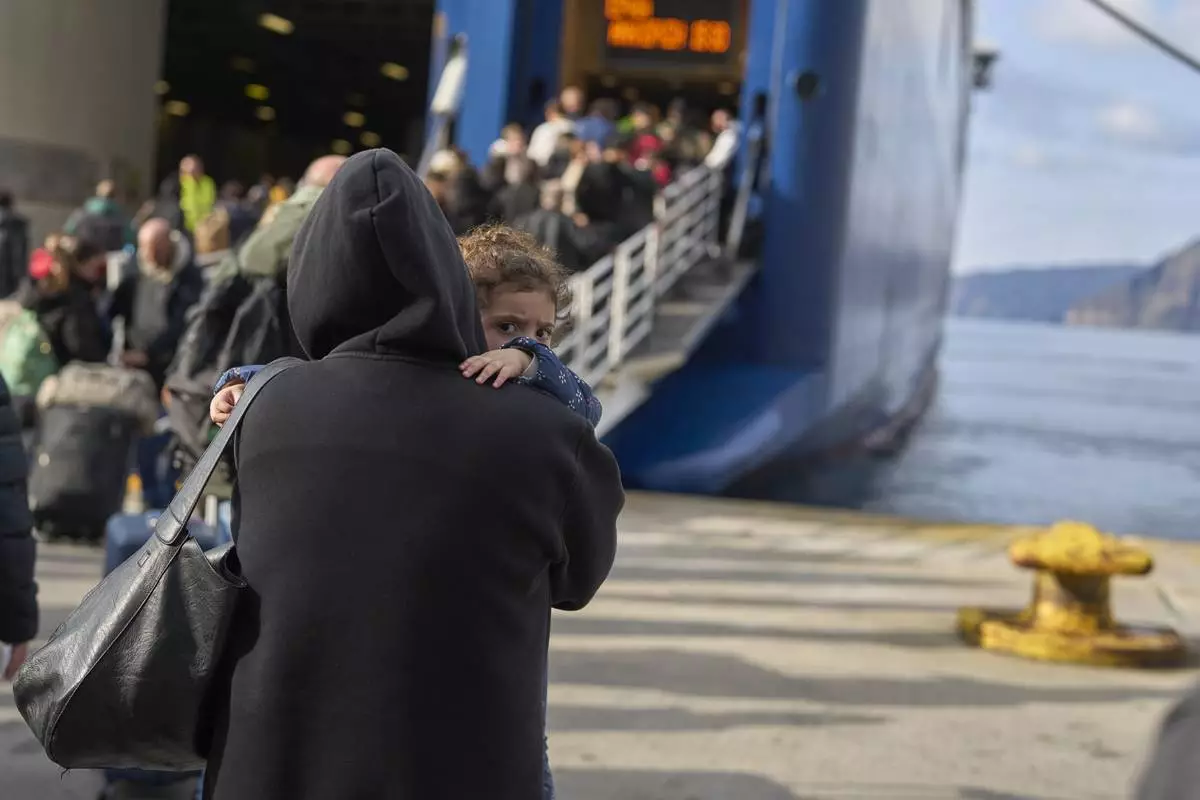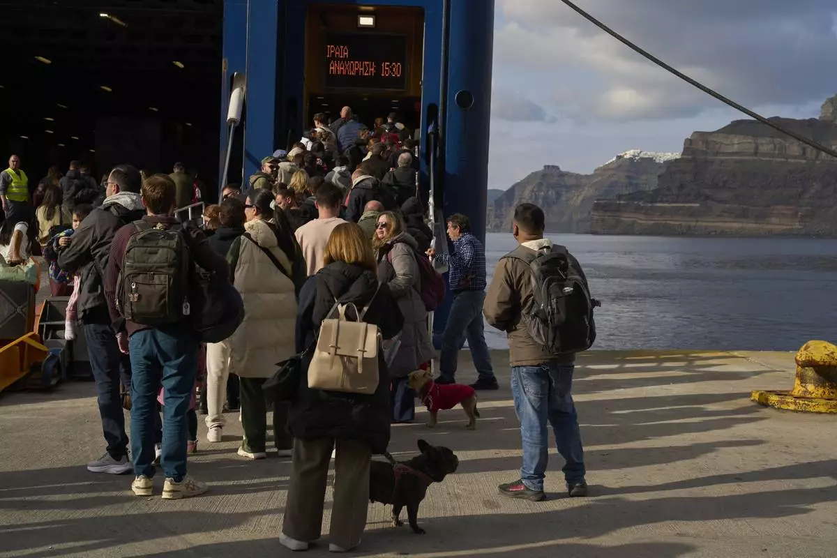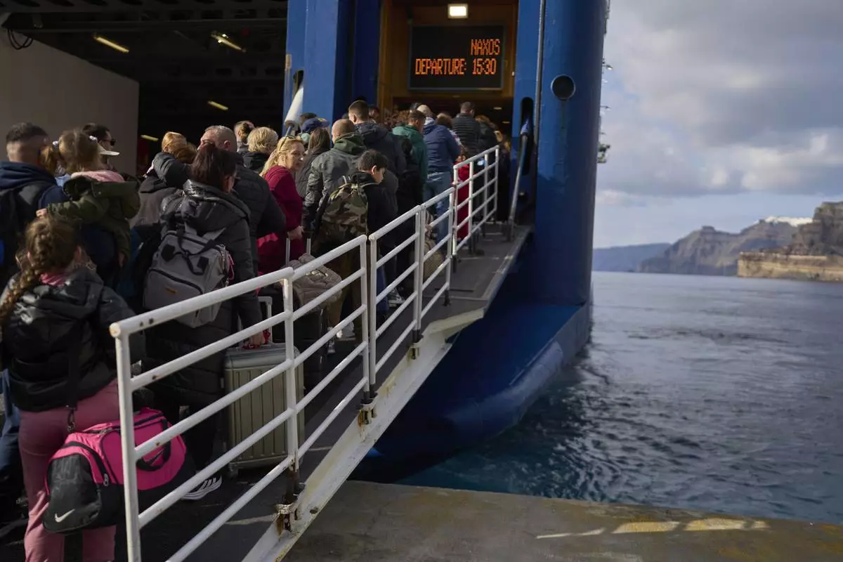 Passengers board a regularly scheduled ferry to Athens' port of Piraeus, after a spike in seismic activity raised concerns about a potentially powerful earthquake in Santorini, southern Greece, Monday, Feb. 3, 2025. (AP Photo/Petros Giannakouris)
