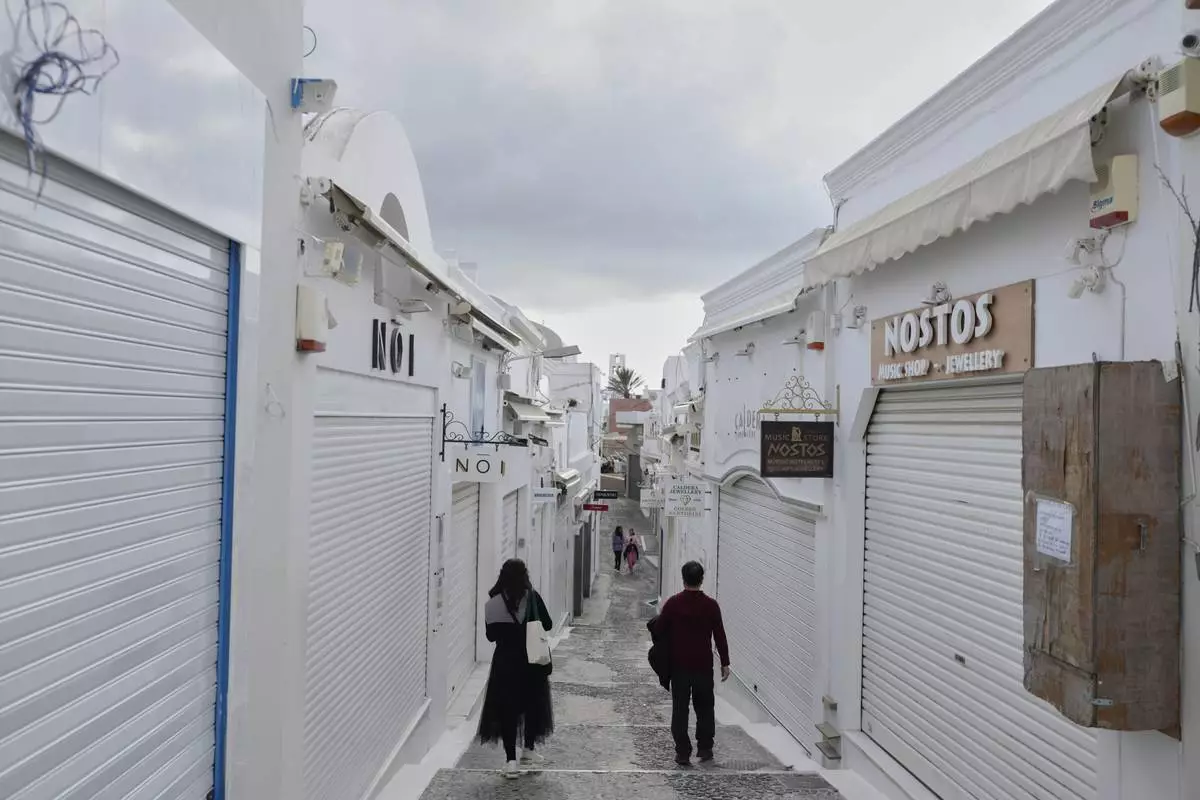 Tourists pass by closed shops in Fira town as Greek authorities are taking emergency measures in response to intense seismic activity on the popular Aegean Sea holiday island of Santorini, southern Greece, Monday, Feb. 3, 2025. (AP Photo/Petros Giannakouris)