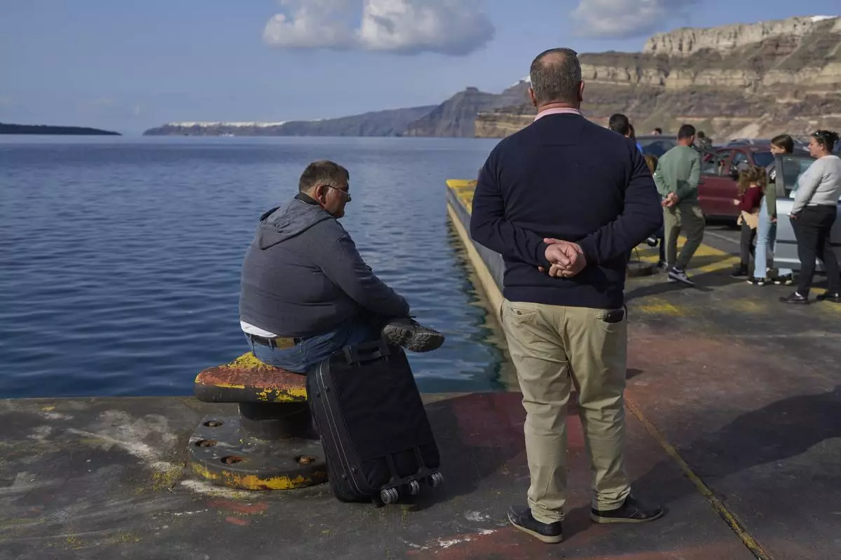 Passengers wait for the arrival of a regularly scheduled ferry to Athens' port of Piraeus, after a spike in seismic activity raised concerns about a potentially powerful earthquake in Santorini, southern Greece, Monday, Feb. 3, 2025. (AP Photo/Petros Giannakouris)