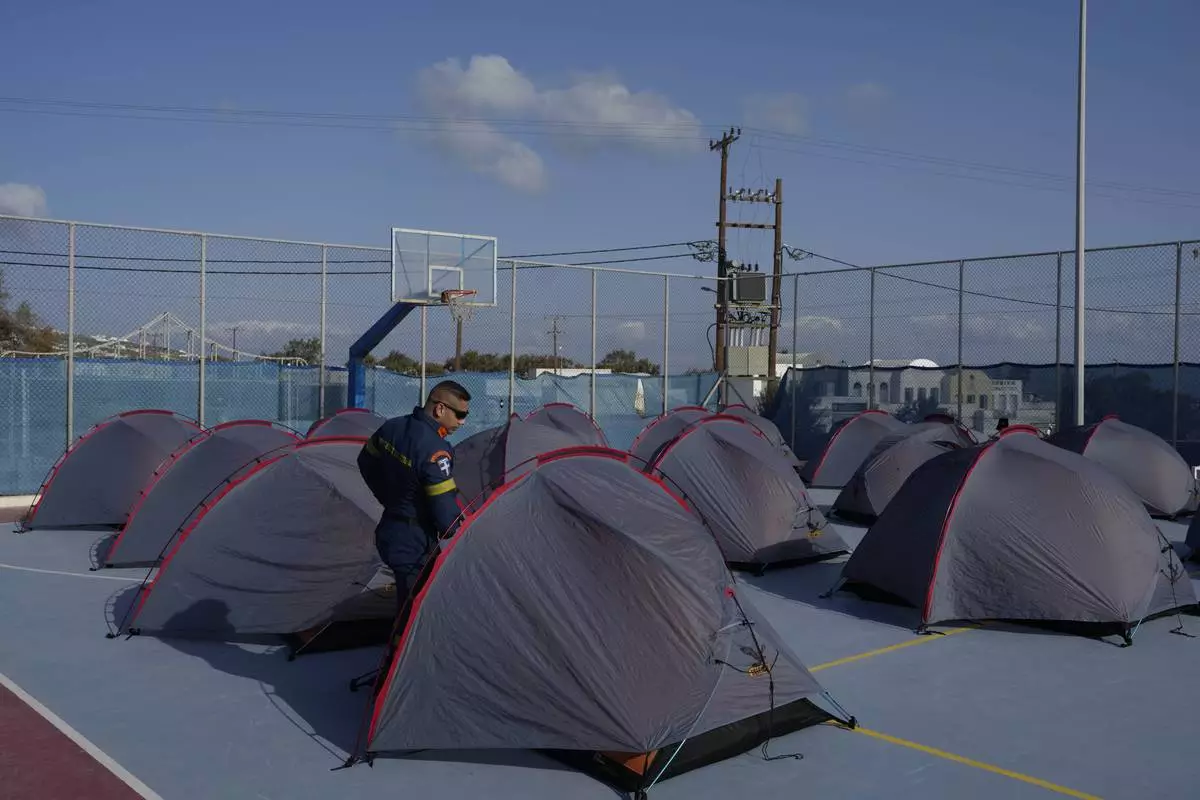 A firefighter walks next to tents set up at a basketball court to accommodate Fire Service rescuers as Greek authorities is taking emergency measures in response to intense seismic activity on the popular Aegean Sea holiday island of Santorini, southern Greece, Monday, Feb. 3, 2025. (AP Photo/Petros Giannakouris)