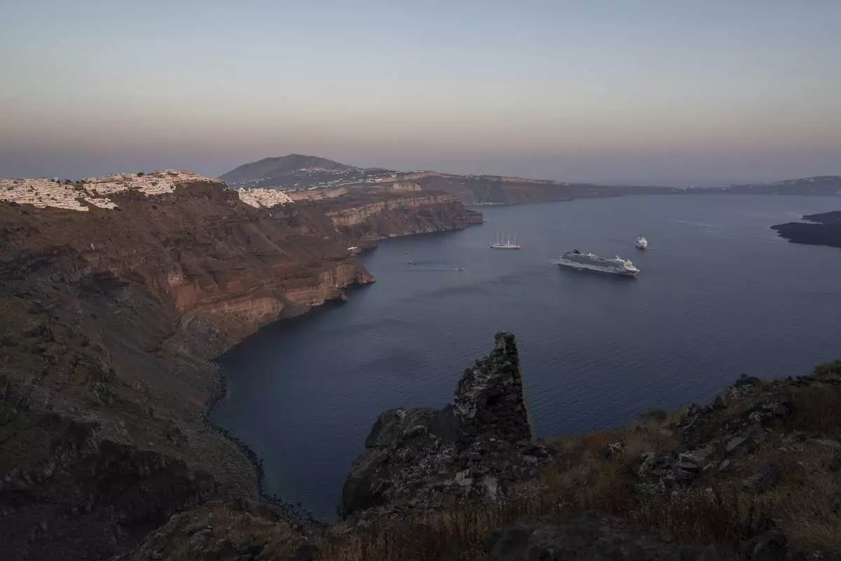 FILE - Ruins of a settlement, including a former Catholic monastery, lie on the rocky promontory of Skaros on the Greek island of Santorini, on June 15, 2022. (AP Photo/Petros Giannakouris, File)