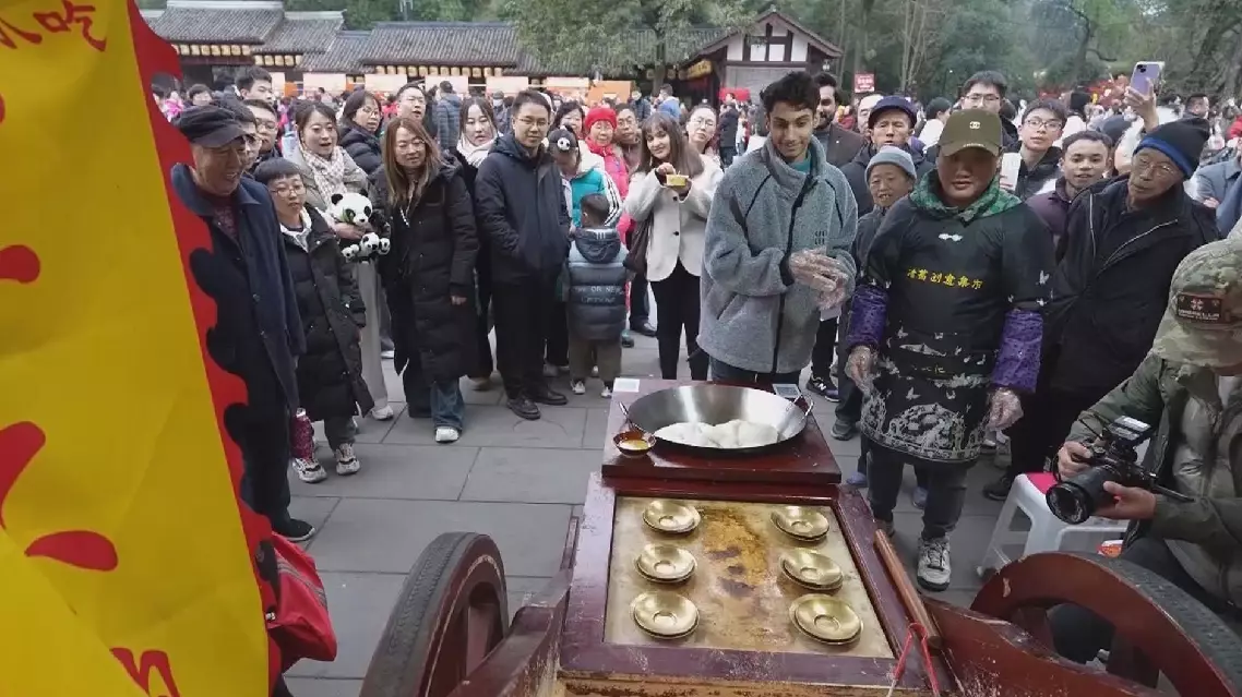 The temple fair at Wuhou Shrine also hosted nearly 100 stalls featuring local delicacies. Foreign tourists can not only enjoy sugar-figurine blowing and dough modeling, but try to make local snack "Sandapao," a dessert made of glutinous rice.