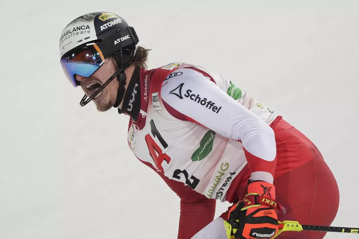 Austria's Manuel Feller celebrates at the finish area of an alpine ski, men's World Cup slalom, in Schladming, Austria, Wednesday, Jan. 29, 2025. (AP Photo/Giovanni Auletta)