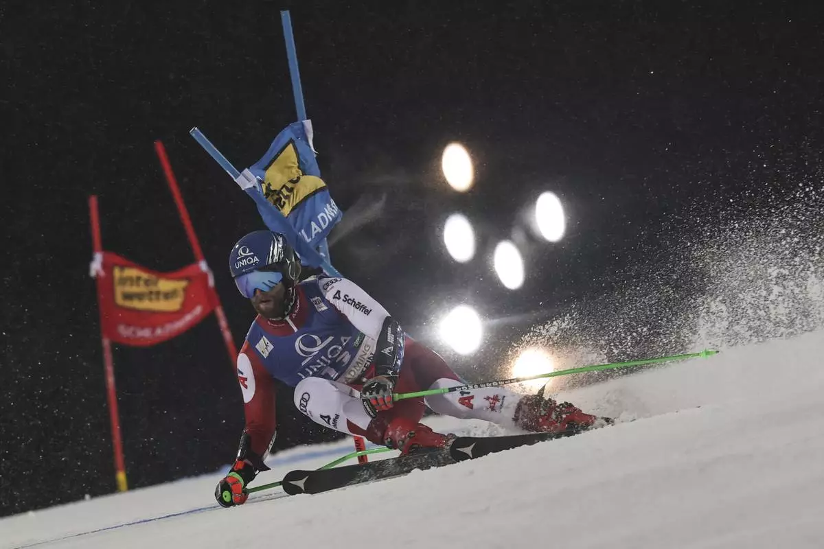 Austria's Marco Schwarz competes in the men's World Cup giant slalom in Schladming, Austria, Tuesday, Jan. 28, 2025. (AP Photo/Giovanni Auletta)