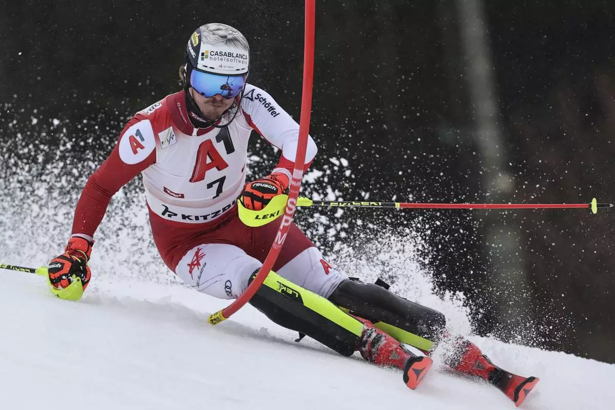 Austria's Manuel Feller speeds down the course during an alpine ski, men's World Cup slalom, in Kitzbühel, Austria, Sunday, Jan. 26, 2025. (AP Photo/Marco Trovati)