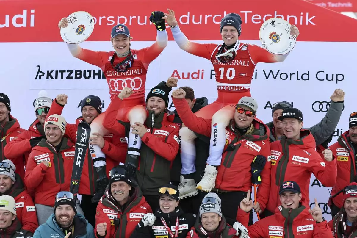 Switzerland's Marco Odermatt, top left, winner of an alpine ski, men's World Cup Super-G, and third-placed Switzerland's Stefan Rogentin, top right, celebrate with the team, in Kitzbuehel, Austria, Friday, Jan. 24, 2025. (AP Photo/Marco Trovati)