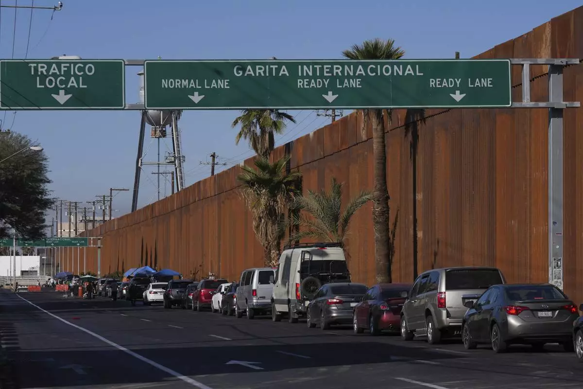 Drivers wait in line to enter to U.S, in Mexicali, Mexico, Saturday, Feb. 1, 2025. (AP Photo/Fernando Llano)
