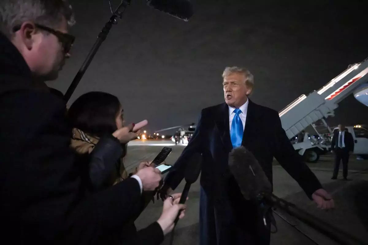 President Donald Trump speaks to reporters next to Air Force One after arriving back at Joint Base Andrews, Md., Sunday, Feb. 2, 2025. (AP Photo/Ben Curtis)