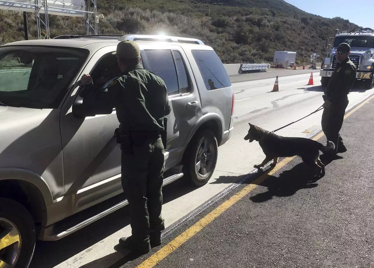 FILE - Border patrol agents use a drug sniffing dog to check vehicles at California's Pine Valley checkpoint, on the main route from Arizona to San Diego, Dec. 14, 2017 (AP Photo/Elliot Spagat, File)