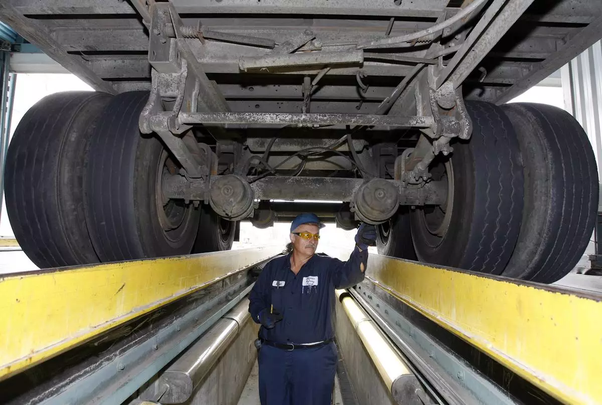 FILE - California Highway Patrol commercial vehicle inspector Ruben Montanez inspects the undercarriage of a truck entering the U.S. from Mexico at the CHP's Otay Mesa Inspection Station Thursday, Sept. 6, 2007, in San Diego. (AP Photo/Denis Poroy)