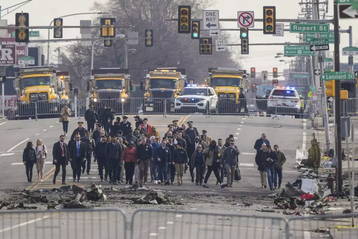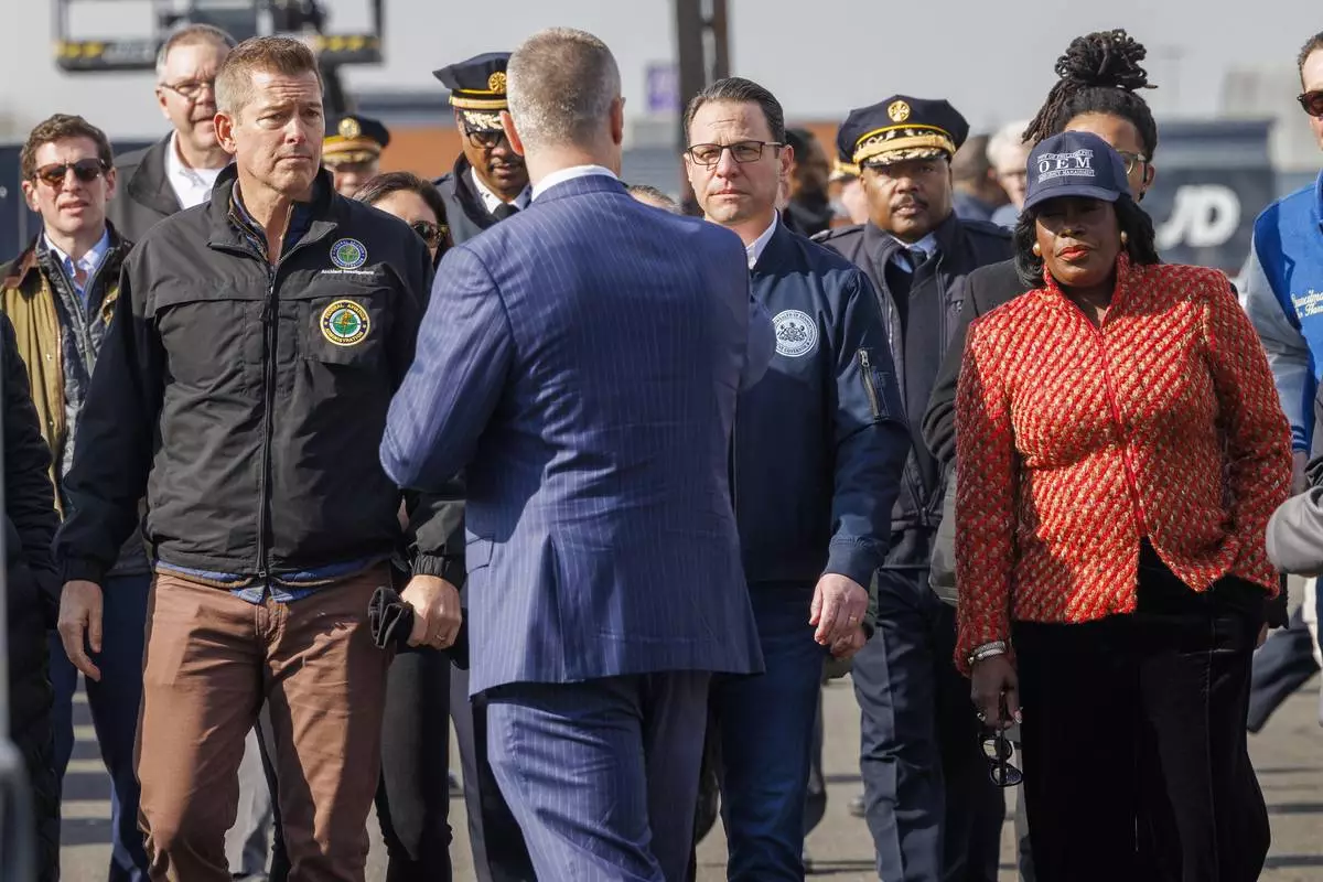 Pennsylvania Gov. Josh Shapiro, Philadelphia Mayor Cherelle Parker and other officials view the aftermath of a fatal small plane crashed in Philadelphia, Monday, Feb. 3, 2025. (AP Photo/Matt Rourke)