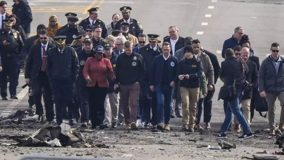 From left; United States Secretary of Transportation Sean Patrick Duffy, Pennsylvania Governor Josh Shapiro and Philadelphia Mayor Cherelle Parker along with Philadelphia Managing Director Adam Thiel walk through the scene of a fatal medical jet crash Monday, Feb. 3, 2025, in Philadelphia. (Alejandro A. Alvarez/The Philadelphia Inquirer via AP)