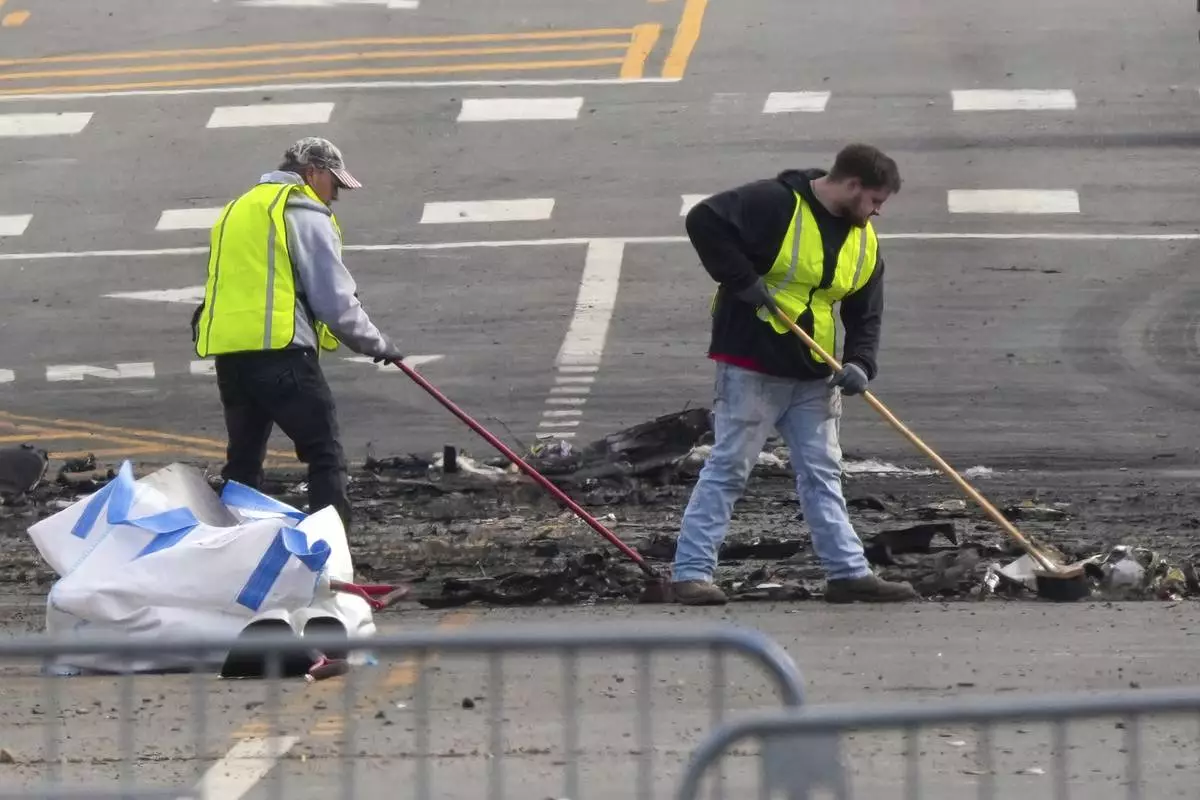 Workers picking up debris at the scene of medical jet crash Monday morning Feb. 3, 2025, in Philadelphia. (Alejandro A. Alvarez /The Philadelphia Inquirer via AP)